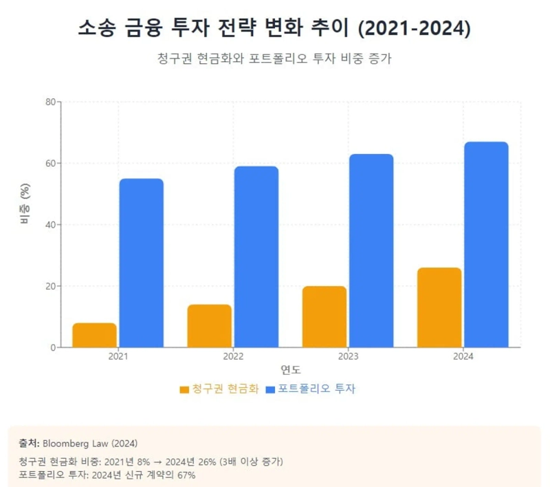 또한 하나의 사건에만 투자하던 과거와 달리, 여러 소송을 묶어 투자하는 '포트폴리오 투자'가 늘고 있다. 현재 신규 계약의 약 67%가 이런 형태로 이루어지고 있으며, 이는 리스크를 분산하고 수익 구조를 안정화하려는 전략이 한층 정교해지고 있다는 뜻이다.