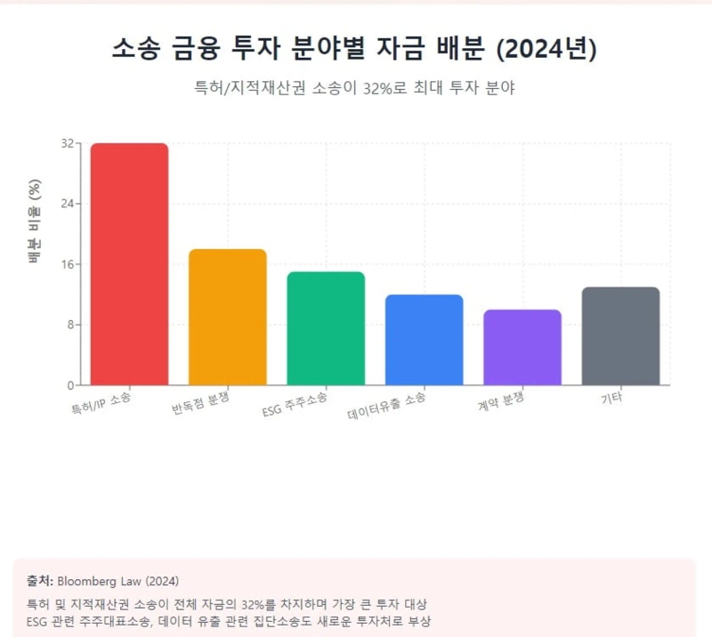 이들 선도 기업은 주로 부가가치가 높은 대규모 상업 분쟁에 투자를 집중하고 있다. 특히 막대한 소송 비용과 높은 잠재 배상액을 특징으로 하는 특허 및 지적 재산(IP) 소송이 핵심 투자 대상이다. 블룸버그 로에 따르면 작년 기준 특허 소송 관련 자금 배분이 전체의 32%를 차지한다. 최근에는 환경·사회·지배구조(ESG) 관련 주주대표소송, 데이터 유출 관련 집단소송 등도 새로운 투자처로 부상하고 있다.