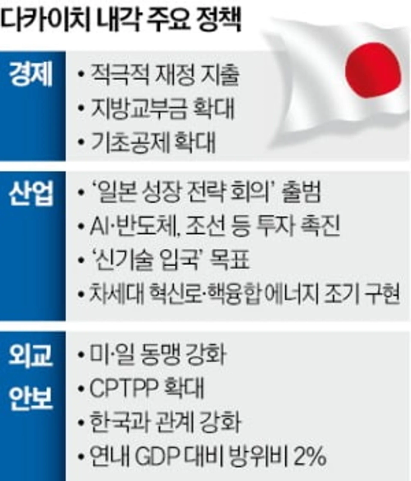 - 다카이치 일본 총리는 적극 재정 지출과 추가경정예산 편성 방침을 밝혔고, 이는 인플레이션 우려 속에서 물가 자극 위험이 제기된다고 전했다.