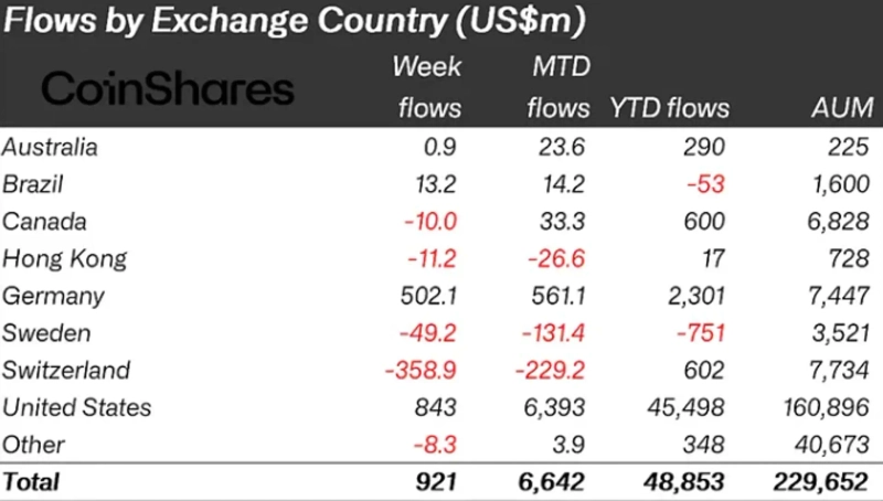 국가별로는 미국발 유입세가 강했다. 미국 기반 가상자산 상품에서만 약 8억4300만 달러가 순유입됐고, 독일과 브라질에서 각각 5억200만 달러, 1320만 달러가 들어왔다. 반면 스위스와 스웨덴은 각각 3억5890만 달러, 4920만 달러가 빠져나갔다.