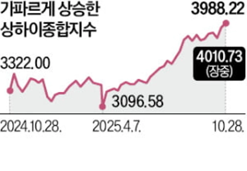 상하이종합지수는 이날 전 거래일 대비 0.22% 하락한 3988.22로 장을 마쳤다. 오전 장중에는 4010.73까지 치솟으며 4000선을 돌파했다. 중국 대표 지수인 상하이종합지수가 4000을 넘어선 건 2015년 8월 19일 이후 10년2개월 만이다.