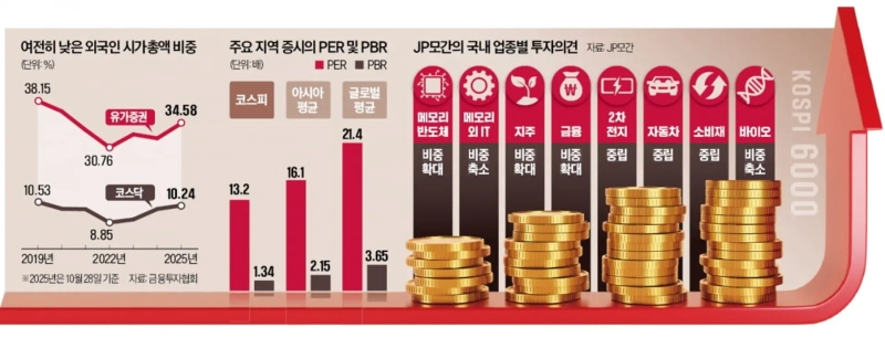 "글로벌 유동성이 완화되며 주식 가치가 높아지고 있는 시점에서 한국 증시의 밸류에이션(실적 대비 주가 수준) 또한 재평가될 수 있다. 1년 후 코스피지수 6000도 가능하다."(JP모간)