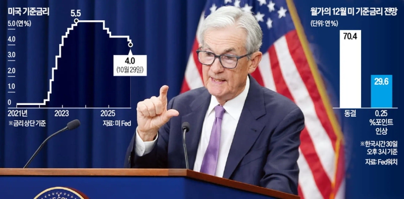 미국 중앙은행(Fed)이 29일(현지시간) 연방공개시장위원회(FOMC)에서 예상대로 기준금리를 0.25%포인트 인하했다. 하지만 제롬 파월 의장이 "12월 금리 인하는 기정사실이 아니다"고 밝히면서 시장 분위기가 냉각됐다. 당초 시장에선 12월 기준금리 인하를 예상했지만 파월 의장의 발언이 '매파적'(통화긴축 선호)으로 해석되면서 시장에선 12월 금리 동결 확률이 70% 이상으로 높아졌다.