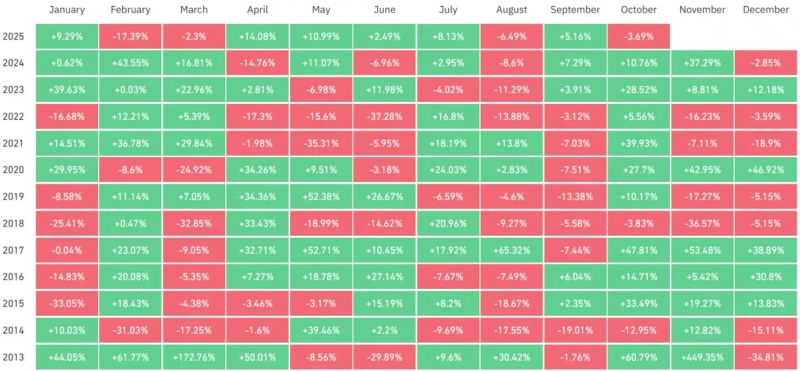 코인글래스에 따르면 올해 10월 한 달 동안 비트코인 가격은 3.69% 하락했다. 2013년 이후 비트코인의 10월 월간 수익률이 마이너스를 기록한 것은 2014년(-12.95%)과 2018년(-3.83%)에 이어 세 번째다. 암호화폐 매체들은 "'레드 옥토버'(하락의 10월)는 매우 보기 드문 일"이라고 했다.