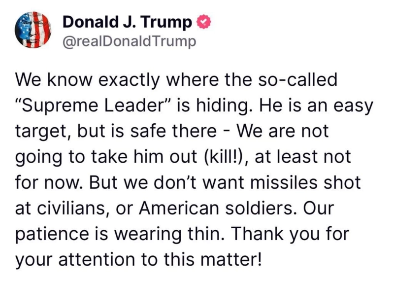 トランプ大統領はこの日、SNSでイラン最高指導者に言及し「彼は簡単な標的だ」と述べた。さらに「少なくとも今は彼を排除(殺害)しないだろう」とした。また「我々はイラン上空に対する完全かつ全面的な支配権を確保した」とも述べた。「我々」とは米国とイスラエルを指すと解釈される。
