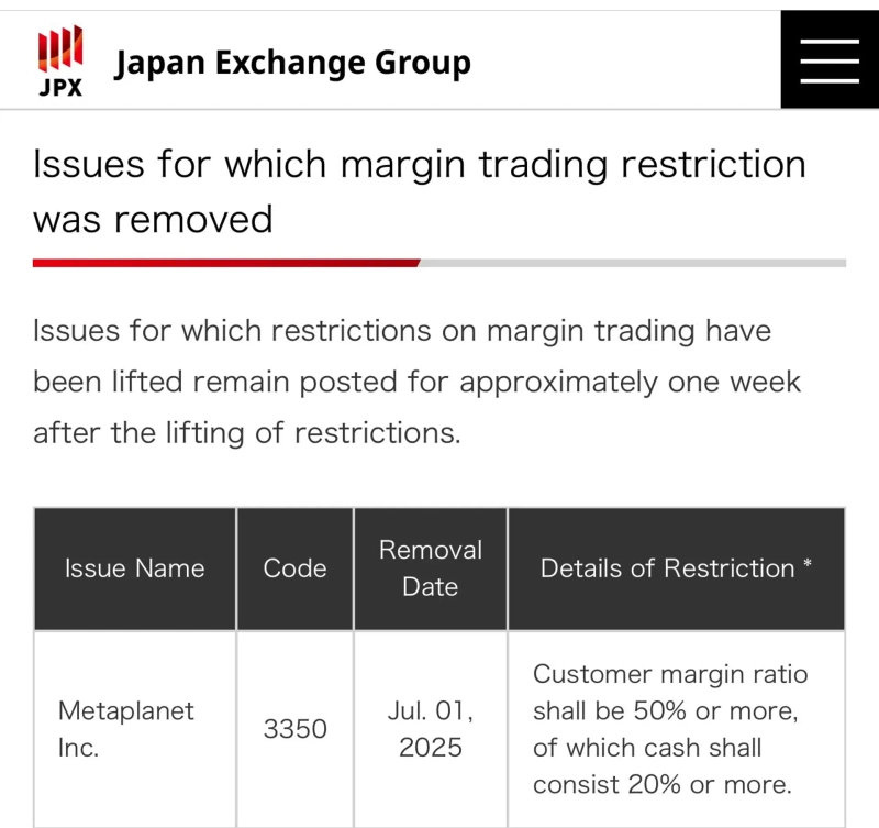日本の東京証券取引所(TSE)がメタプラネットの信用取引制限措置を解除することが明らかになった。