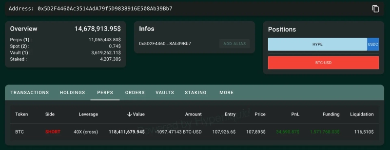 - 現在の未実現利益は1,420万ドル、ポジションの清算価格は116,510ドルと報じられています。