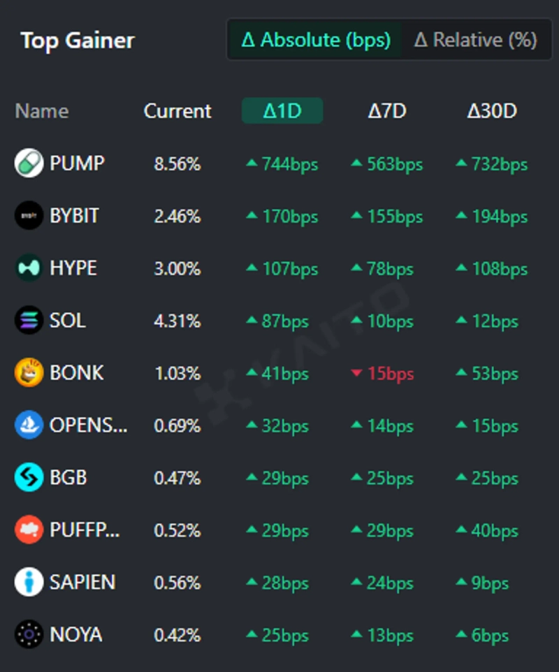AI(人工知能)ベースのWeb3サーチプラットフォームKaito(Kaito)のトークン・マインドシェア(Token Mindshare、仮想資産市場における特定トークンの影響力を定量化した指標)トップゲイナーによると、13日現在、人々が最も注目している暗号資産関連のキーワード上位5つは、ポンプドットファン(PUMP)、バイビット、ハイパーリキッド(HYPE)、ソラナ(SOL)、ボンク(BONK)などです。