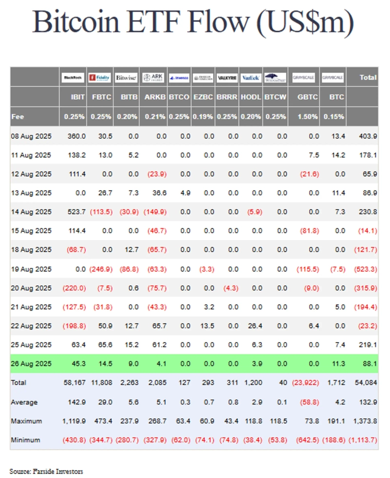 26日(現地時間)、ファサイド・インベスターのデータによると、ビットコイン現物ETF商品には8,810万ドルの資金が流入しました。最も大きな流入を記録した商品はブラックロックのIBITで、合計4,530万ドルの流入が発生し、フィデリティのFBTC(1,450万ドル)、ビットワイズのBITB(900万ドル)がそれに続きました。