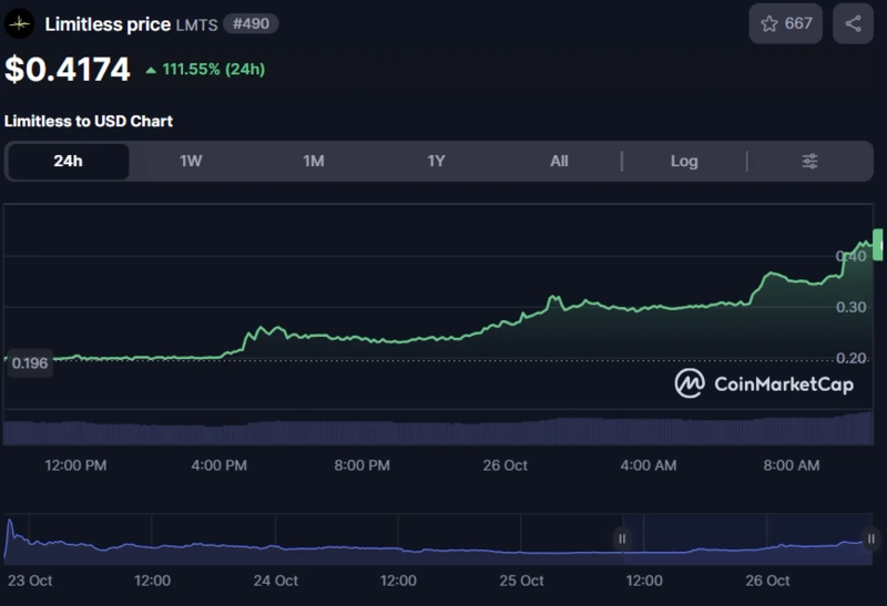 26日(韓国時間) 暗号資産(仮想通貨)の相場情報提供サイトCoinMarketCapによると、リミットレスは前日比111.55%急騰し、0.4174ドルで取引されている。