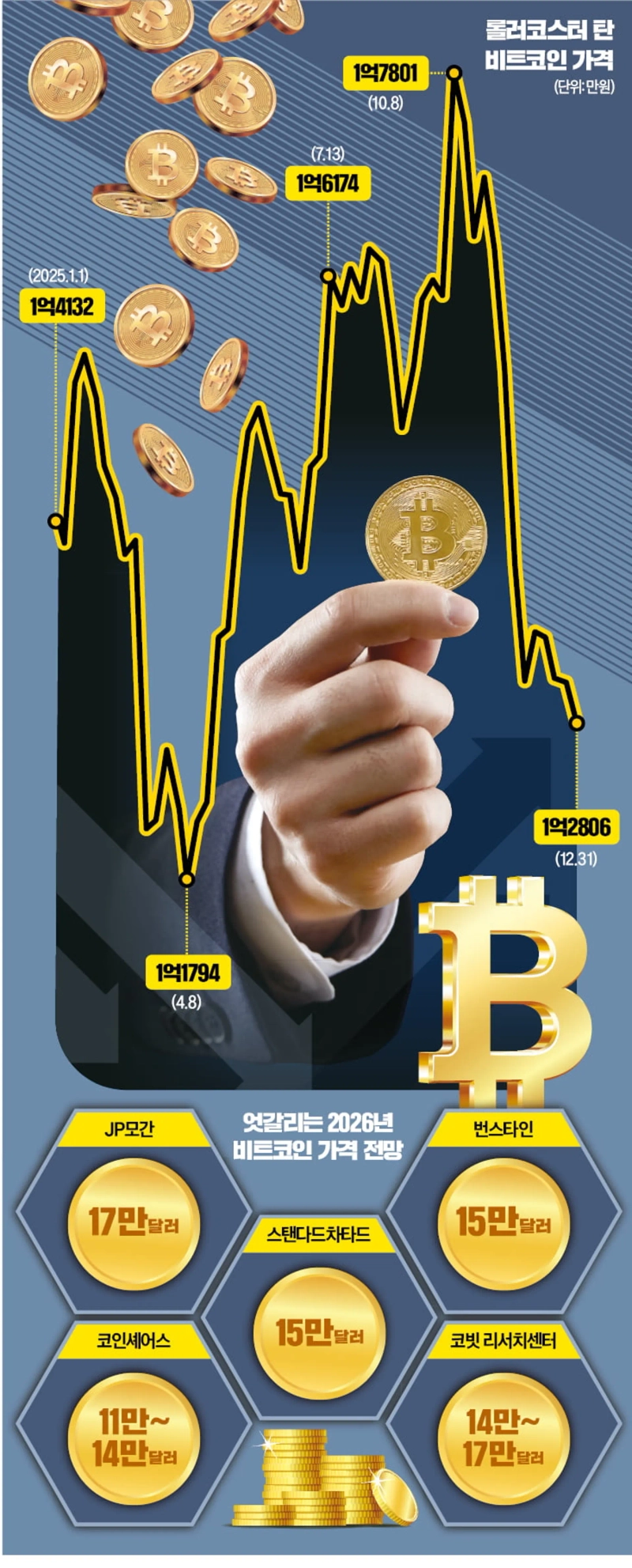 올해도 비트코인 가격 널뛰기는 이어질 전망이다. 업계에서는 17만달러 돌파를 예상하는 낙관론과 단기 조정을 예고하는 신중론이 교차하고 있다. 주요 중앙은행의 금리 인하 여부와 상장지수펀드(ETF), 기업 자금 유입 등이 비트코인 가격의 향방을 가를 핵심 변수로 꼽힌다.